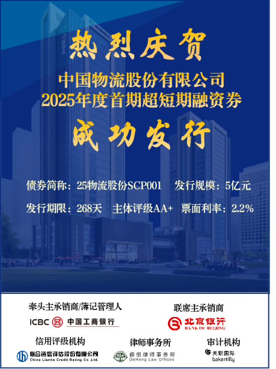 4月22日,中国物流股份有限公司成功发行2025年度首期超短期融资券,发行期限268天,发行规模5亿元,票面利率2.2%。